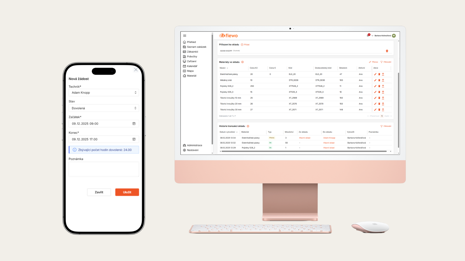 Do Fiewo jsme přidali několik novinek, které vám usnadní práci v terénu i v administraci. Patří mezi ně nová skladová evidence materiálu a vylepšené počítání dovolených a nepřítomností.