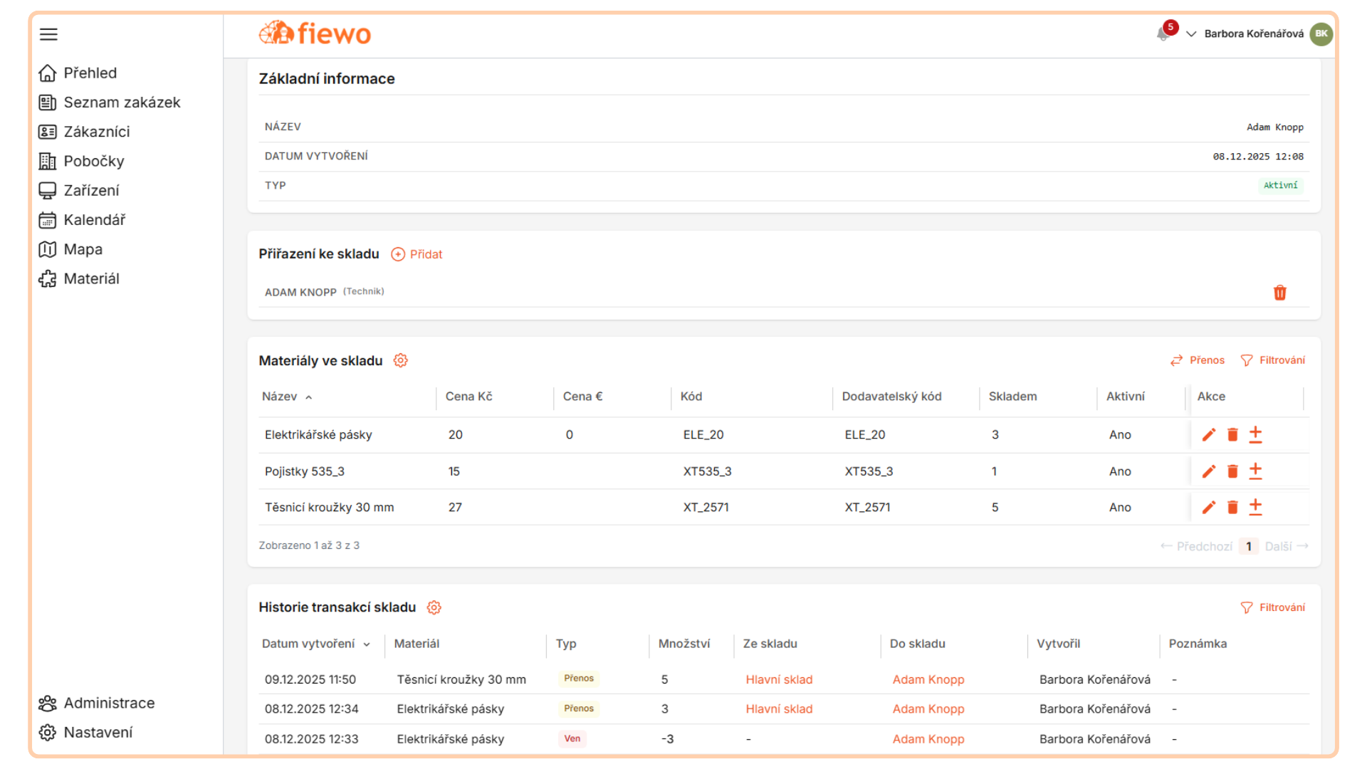 Každé doplnění, přesun i vydání materiálu se ve Fiewo automaticky zaznamenává. V historii tedy vždy vidíte, co bylo přidáno, kdo materiál přesunul a jakých skladů se přesun týkal.